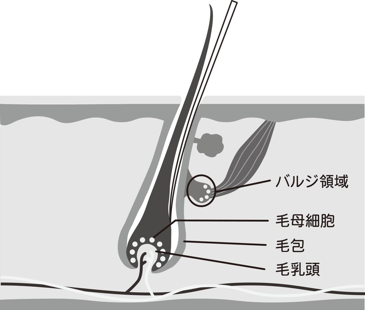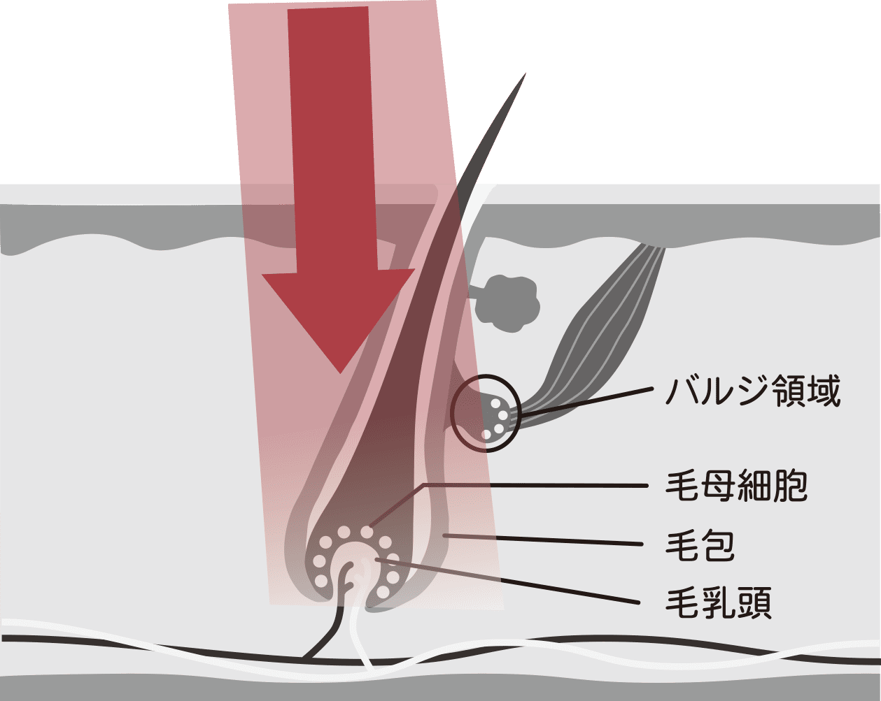照射すると、メラニン色素のある毛球部付近で熱に変わり、その熱が毛球部の毛乳頭や毛母細胞などの発毛組織を「破壊」します。