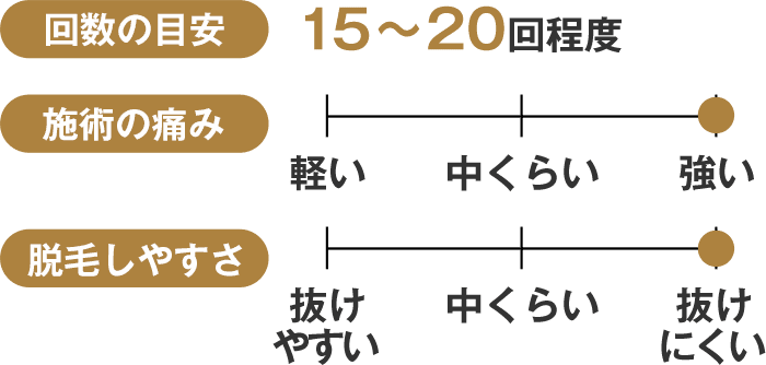 - ※ 回数の目安は、SHR脱毛を基準とした脱毛完了までの施術回数のおおよその目安です。脱毛効果には個人差があるため増減することがあります